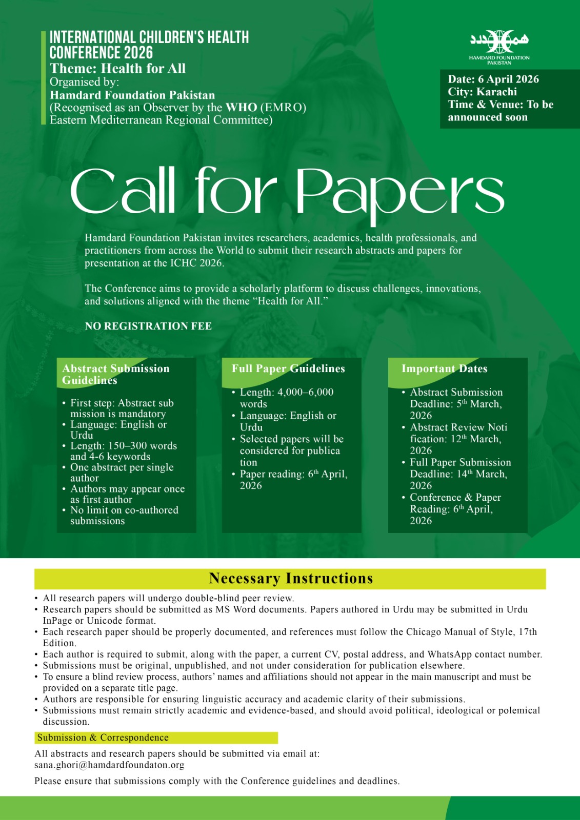 The 34th International Children’s Health Conference 2026, to be held in Karachi on 6 April 2026, in connection with World Health Day.